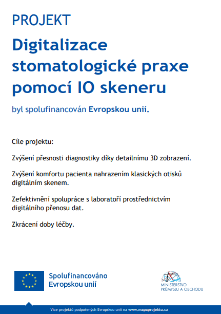 Projekt „Digitalizace stomatologické praxe pomocí IO skeneru“ byl spolufinancován Evropskou unií z Operačního programu Technologie a aplikace pro konkurenceschopnost.